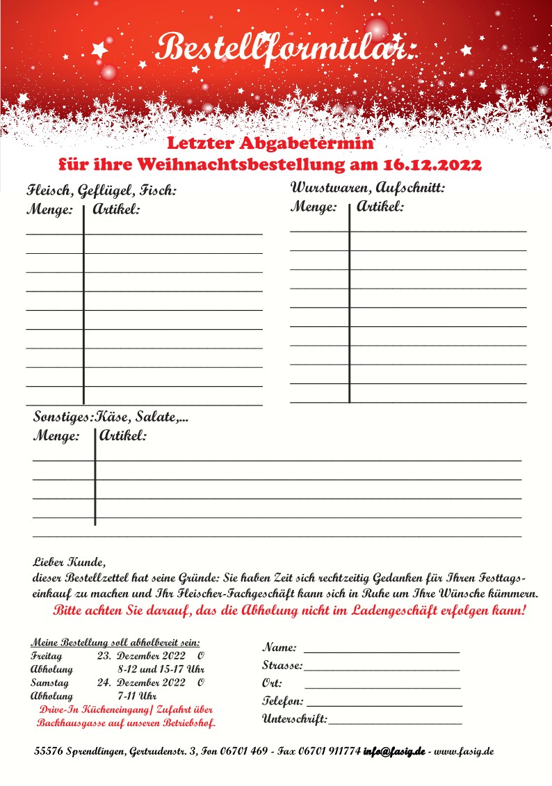 Auch wenn es nur noch wenige Wochen sind! Planen Sie jetzt in aller Ruhe Ihr Essen für die Feiertage – wir beraten Sie gerne! Nutzen Sie einfach unseren Bestellzettel und Weihnachten wird ein Genuss!